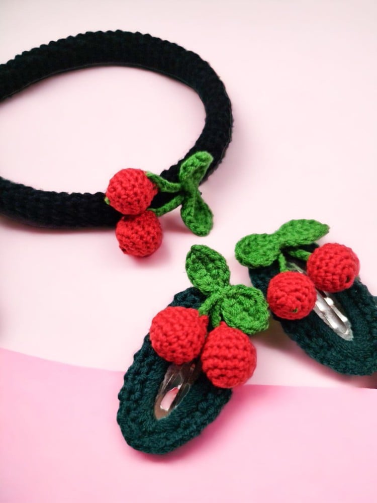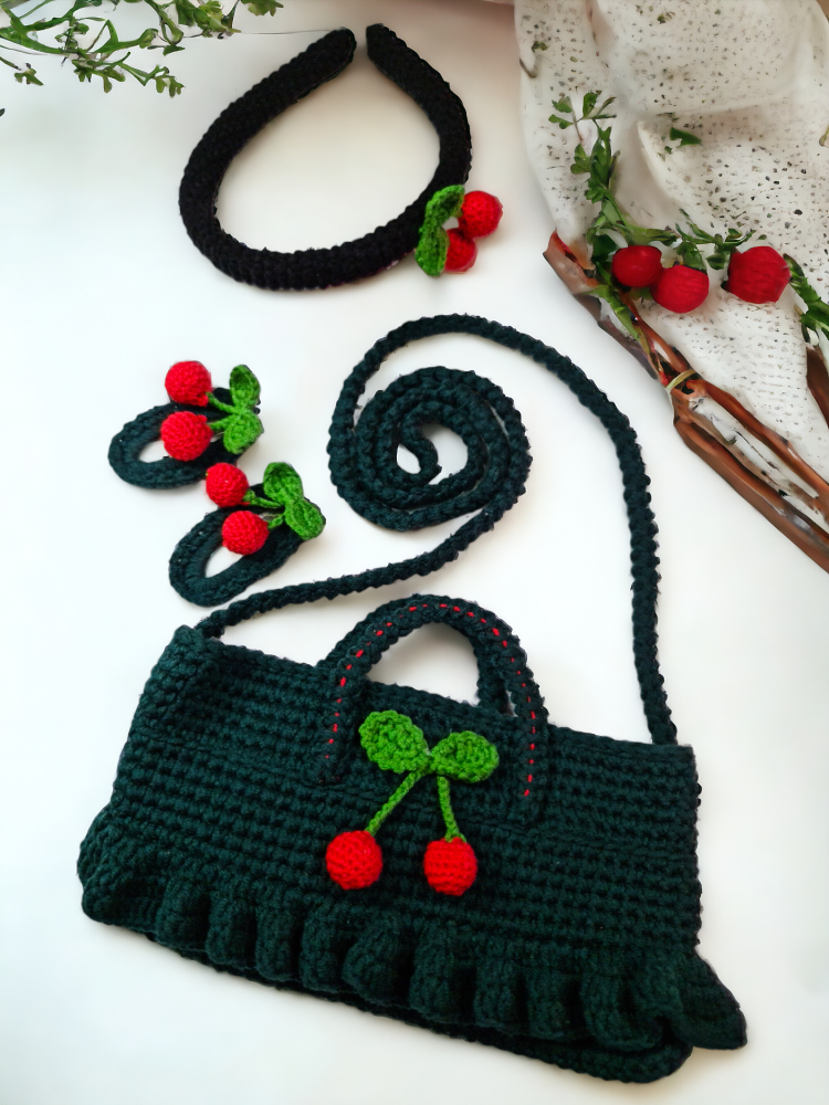 أضف لمسة من الأناقة والجمال إلى إطلالة طفلتك في الأعياد والمناسبات مع طقم الكرز. يتميز طقم بناتي كروشيه بتصميمه الراقي الذي يضم شنطة أنيقة، اكسسوارات للشعر للبنات عبارة عن طوقًا وتوك للشعر، مما يجعله خيارًا مثاليًا لتكملة إطلالة صغيرتك بلمسة ساحرة.