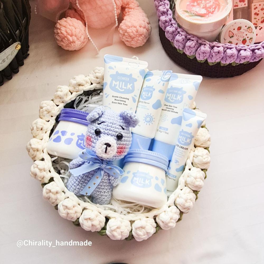 - اسم المنتج : سبت توليب ازرق وابيض / skincare set Milk مع دمية الدبدوب