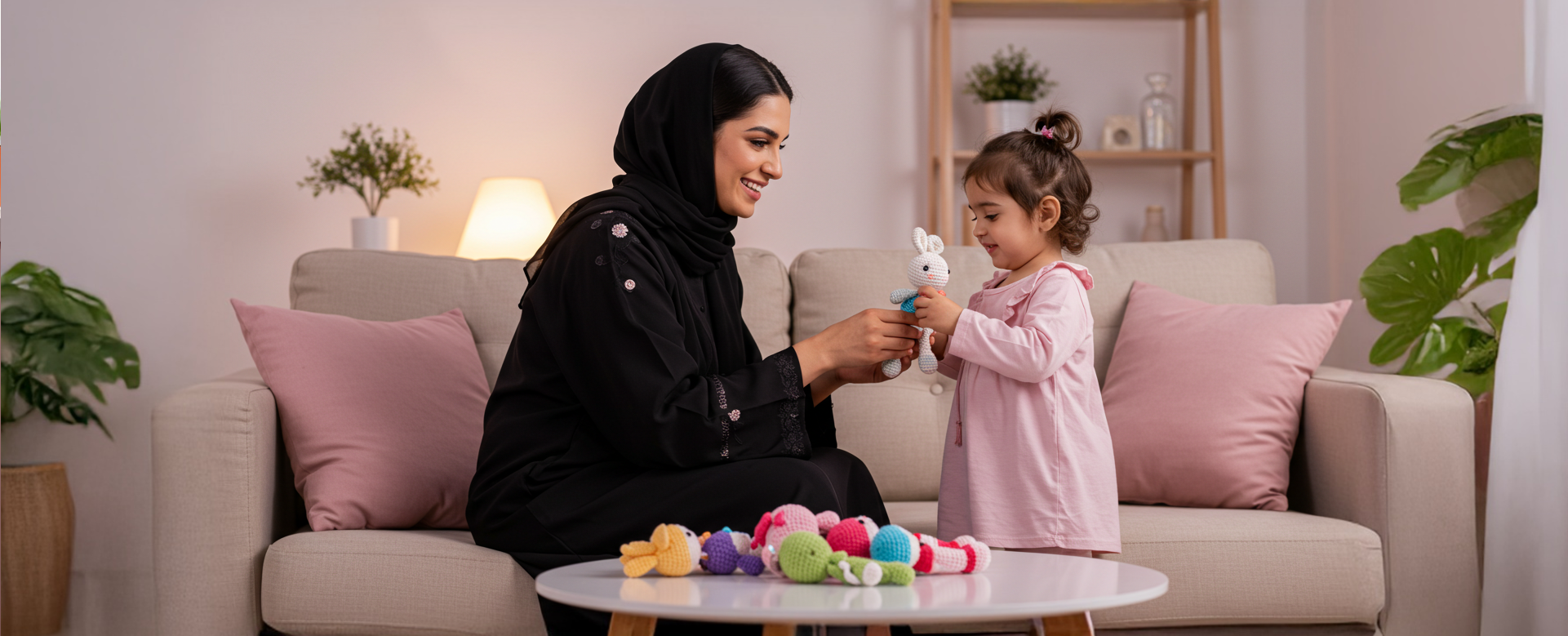 وقت اللعب المشترك بين الأم والطفل أثناء استخدام دمى الكروشيه يعزز الاتصال العاطفي، ويخلق لحظات مميزة تساعد على بناء علاقة ثقة ودعم نفسي قوي.
